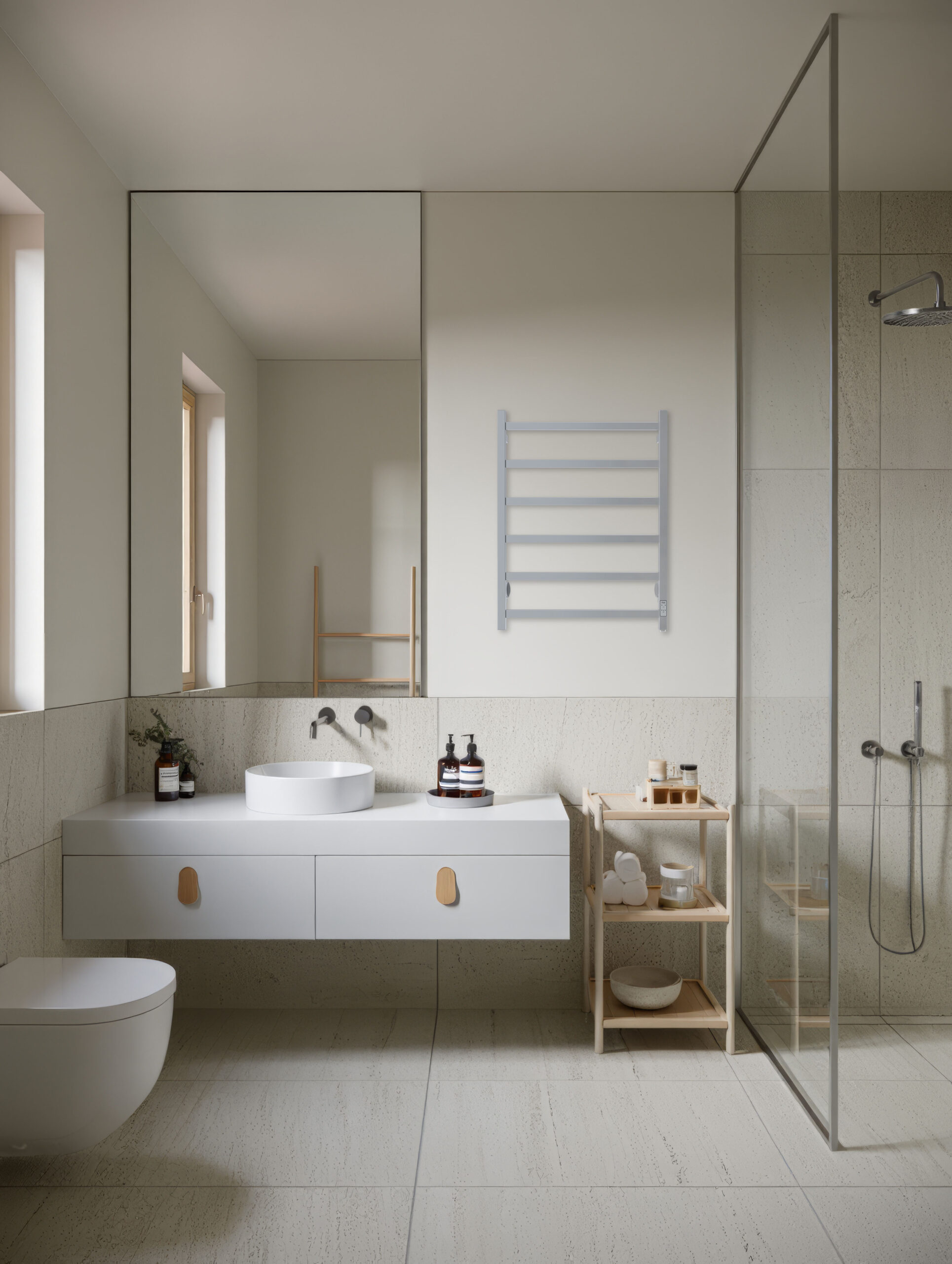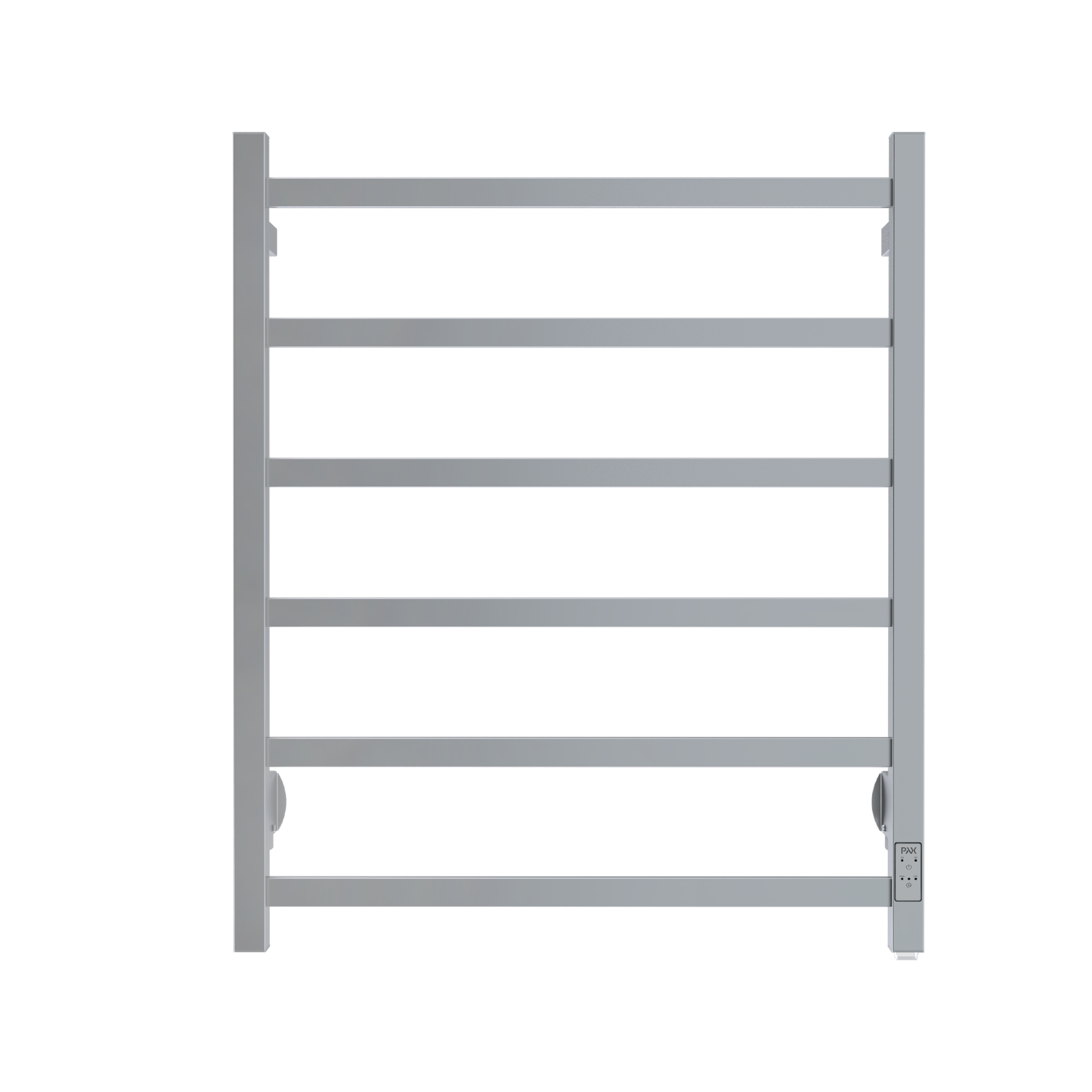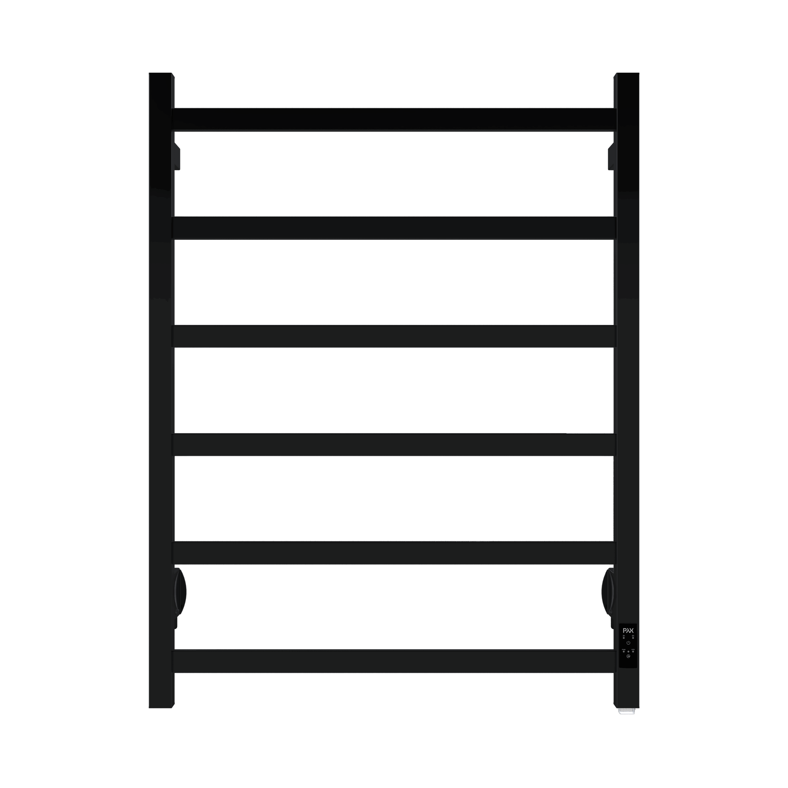 A minimalist six-step towel warmer with clean, square lines. The Pax Duo Tango delivers modern design, precision control, and sustainable comfort in polished or matte black finishes.